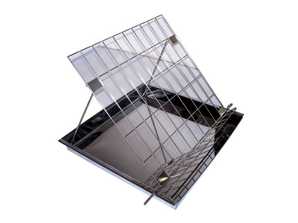 Šikovná pomůcka pro odvíčkování plástů s medem, umísťují se na stojánek, který je součástí samotného obdélníkového talíře. Cenově dostupný celonerezový odvíčkovací talíř. Odvíčkovací tác i mřížka jsou z nerezového materiálu. Spodní rozměr (dno talíře): 44,5x44 cm